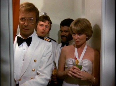 The revolving subplots on The Love Boat didn’t vary greatly from episode to episode, consisting of standard romantic comedy conflicts such as a suitor pursuing an unwilling lover, a married couple trying to rekindle their old flame, the sudden appearance of a former lover disrupting someone’s current relationship, or the inevitable attraction of total opposites. Leftover “shocking” taboos that hadn’t been shocking to anybody for years—such as divorce, living together “in sin,” one-night stands—were grafted onto the familiar stories (one straight, one slapstick, one inbetween per episode generally) to give them an air of “with-it-ness” while giving the whim-whams to all the grannies out their waiting to see their favorite stars on the tube. And of course, any troubling suggestions that this largely dysfunctional romantic world view pictured on The Love Boat might actually be real, were gleefully dashed at the end of each episode: happily, all the newly formed (or reconstituted) couples filed out past the crew, letting the audience know that love (and sex) had once again triumphed.