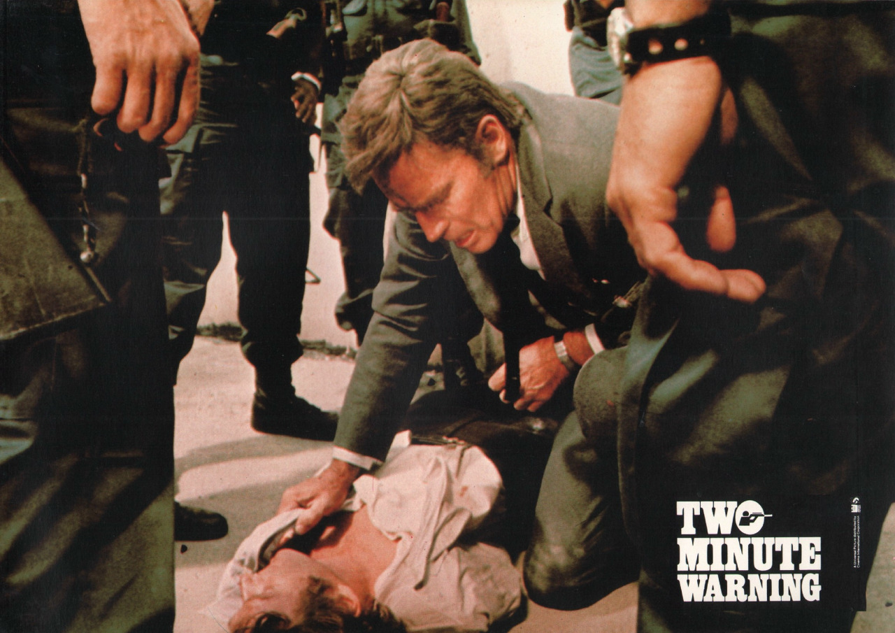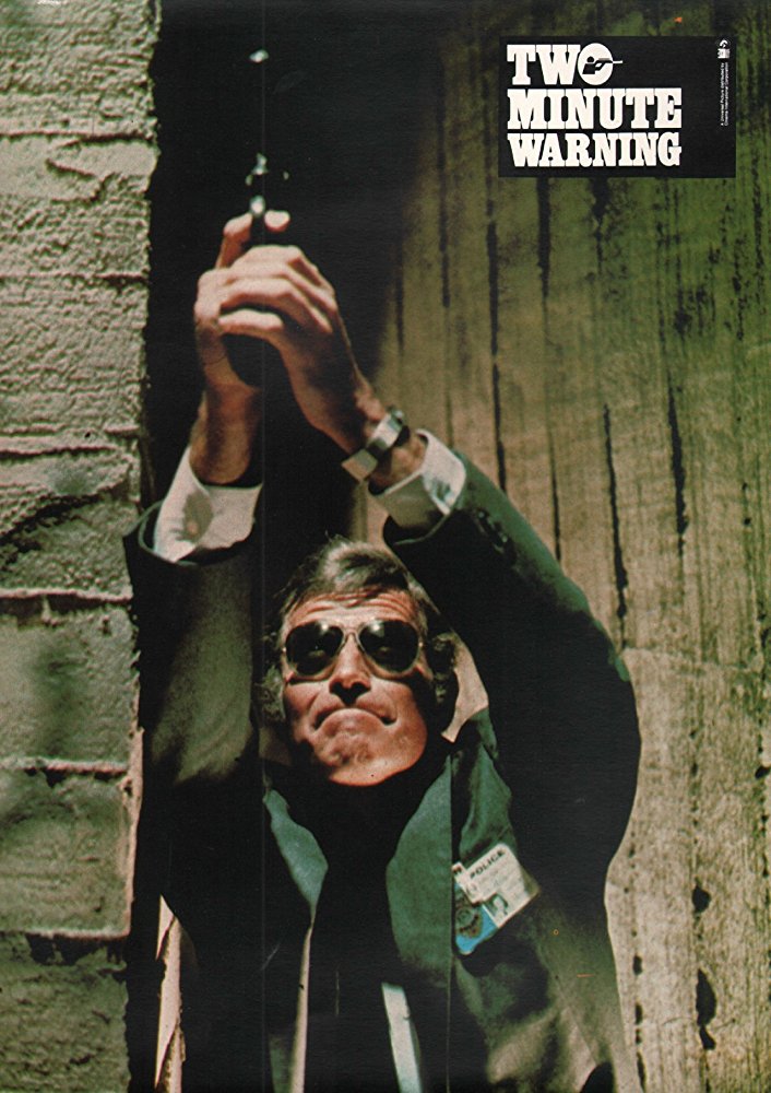 Two-Minute Warning was Universal’s rushed answer to capitalize not only on the then-cresting popularity of disaster movies, but also to take advantage of Charlton Heston’s still potent box office association with the action genre. Heston, a big, big A-list star in the 1950s and 1960s (The Ten Commandments, Ben-Hur), had, like any other headliner, titles in his overall canon that didn’t click with ticket buyers. Still, he was reliably consistent in churning out profit-makers for the studios, even as younger actors began getting the more prestigious assignments as the 1960s closed out. After his starring role in 1968’s Planet of the Apes, however, Heston was on a surprise mid-career resurgence thanks to the sci-fi/fantasy and action genres, with Beneath the Planet of the Apes, The Omega Man, Skyjacked, Soylent Green, and The Three Musketeers racking up big worldwide grosses.