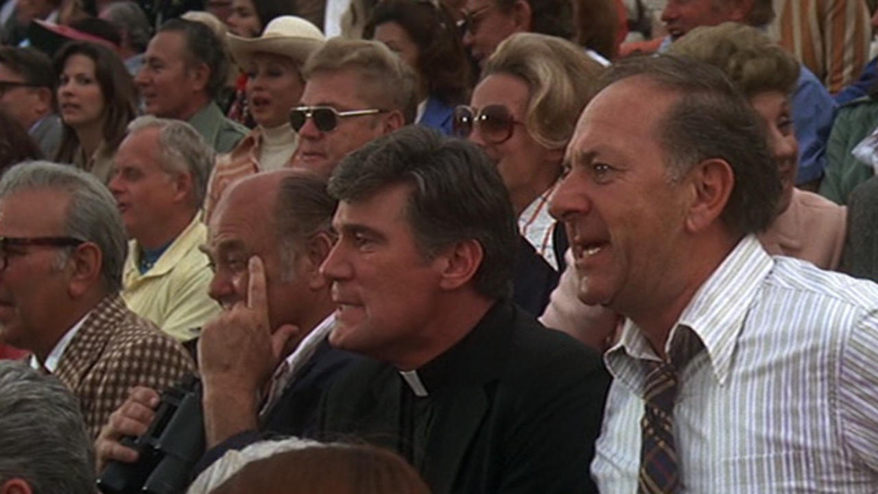 It’s Super Bowl “Championship X” Sunday at the historic Los Angeles Memorial Coliseum, with the Baltimore Whatchamacallits visiting the defending Los Angeles Thingamajigs, and anybody who’s nobody in Hollywood anymore is attending. Aging Los Angeles quarterback Charlie Tyler (Joe Kapp, The Longest Yard, Breakheart Pass), with bad knees and an insanely hot redhead waiting for him back at his hotel room—and I quote: “I’m lonely, Charlie…I need some lovin’,”), will certainly be there, as will his old Boston college buddy, the Priest with No Name (Mitchell Ryan, Magnum Force, Electra Glide in Blue). Kvetching Coliseum manager Sam McKeever (Martin Balsam, Psycho, The Delta Force) has to juggle the many V.I.P.s in attendance, including two governors, seven senators, an Arab prince, and even President Gerald Ford, en route from the airport. Cosmically grumpy Baltimore car salesman Steve (David Janssen, The Green Berets, Macho Callahan) has flown in to squint uncontrollably while further verbally abusing his gorgeous live-in girlfriend, Janet (Gena Rowlands, Machine Gun McCain, Tony Rome), who can’t seem to help herself being friendly with anything in pants.