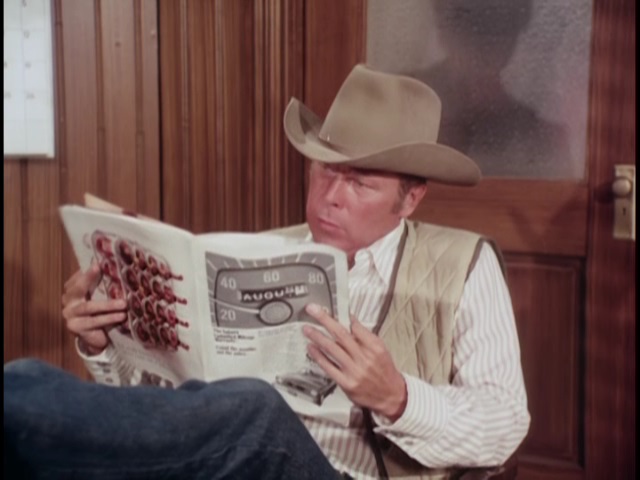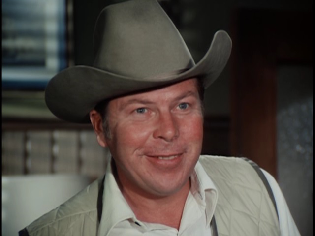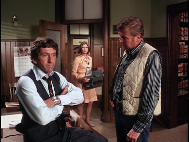 The series opener, directed with some zest by vet Joseph Pevney (Cagney’s Man of a Thousand Faces). Big cast of solid pros for this one, including Joseph Campanella (good playing vicious), Rosemary Forsythe, Morgan Woodward, and William Windom earning some eating money in a small role. Thank god they didn’t keep barkeep Rose Marie as a supporting player. Woodward, always terrific, essays another memorably nasty villain, calling Maggie a tramp and stating, “I could do things to you that wouldn’t leave a mark.”