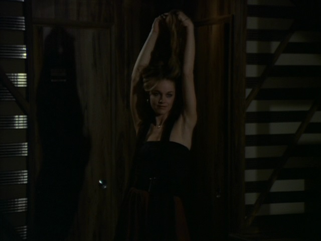 The Shapiros telegraph decadence to all us supposed Midwestern rubes by having Evans and Forsythe laugh at Martin pantomiming rolling up a joint. Yocks galore. Shame to see hot Dark Shadows legend Kathryn Leigh Scott in a crappy little bit part here (and worse: she has to be pawed by irritating-to-say-the-least Wayne Northrop). Lloyd Bochner has a great monologue where he explains to Krystle how Blake is a jungle animal. I know Bochner’s upcoming death in season two is a series’ highlight…but it’s still too bad they couldn’t keep him on the series. He’s always terrific. And Steven makes it clear about his sexual preference: “I’m not ashamed of it.” Now…if we could only figure out which preference he’s not ashamed of….