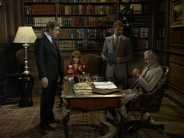 Finally, the overall tone of these 12 episodes is miscued. Expensive-looking, with big sets and expensive costumes and props, this first season of Dynasty expanded even further the already high-gloss house style of ABC dramas of that time. But along with “glossy” came “glassy-eyed,” in Dynasty, as in everyone and everything seemingly timed at 3/4th speed. Somehow someone equated “classy” with “funereal,” because that’s not only the pacing but the ambiance that permeates Dynasty’s initial half season. You’re not going to beat Dallas, that ballsy, crude melodrama, by being classy. You can be classy, but you have to be grotesque, too, and campy, and thankfully, this season’s courtroom finale finally seems to point the way for future Dynasty success, what with its cliffhanger, its ridiculous black and white flashbacks to the murder (love those too-obvious stunt guy stand-ins!), and all the silly overwrought close-ups. When Blake’s mystery ex-wife arrives, and each character is individually freeze-framed in startled alarm—with all the men hilariously grabbing their chins—that’s the kind of stuff we’ll come to expect from the coming seasons of Dynasty.