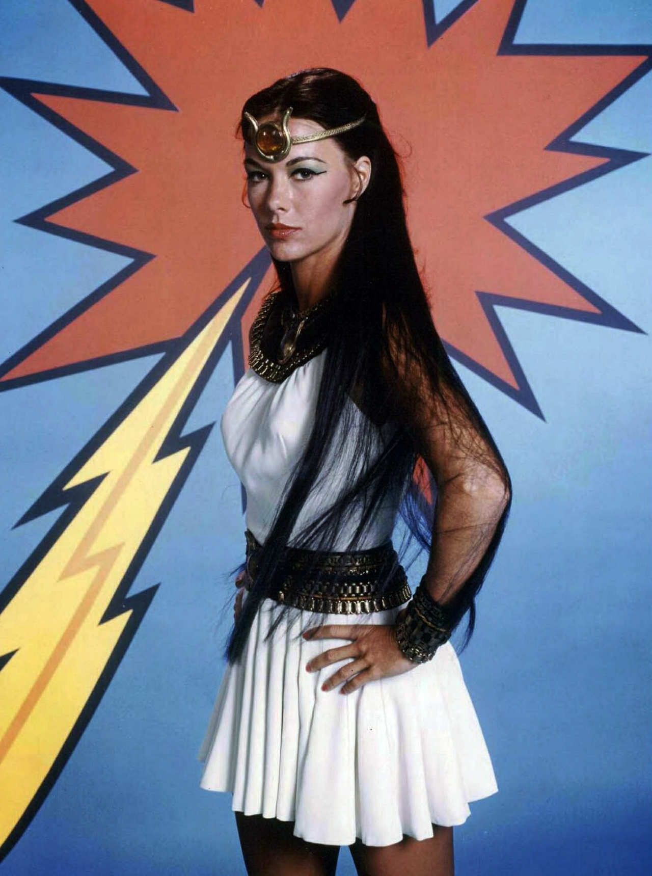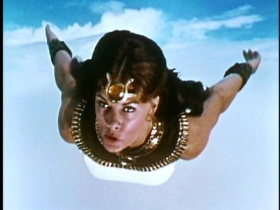 On an archeological dig in Egypt, foxy high school science teacher Andrea Thomas (Joanna Cameron) unearthed a small box that contained an amulet that when worn, gave her powers delivered by the spirit of the Egyptian goddess Isis. When her powers were needed, Joanna simply exposed the amulet, put out her arms in divine supplication (sometimes held up, sometimes down) and calmly called, “Oh Mighty Isis!”. Ka-blam-O! Instantly transformed into a cross between Nefertiti and a tennis pro, Joanna became Isis, holder of super powers that enabled her to perform telekinesis, see into the future, possess super strength and speed, and of course, to fly (“Oh zephyr winds which blow on high, lift me now so I can fly!“).