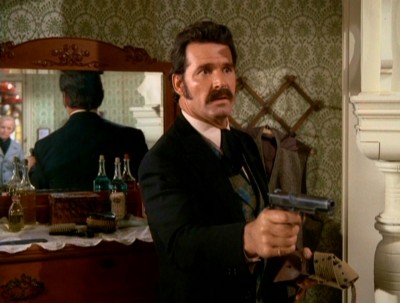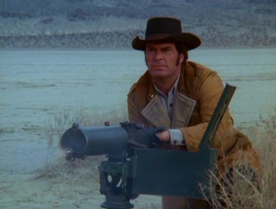 The majority of the TV viewers back in 1971 still wanted to understand where they were in a show, and what was going on, right away. Characters come and go here without rhyme or reason (seeming co-star Paul Hampton is the biggest casualty, in and out in 3 episodes; no need for two scammers when the star/producer’s playing one of them), while others are marginalized to the point of superfluousness (John Beck, so funny as a dangerous dolt here, is eventually so underutilized he stars in two episodes as a different character altogether). We can’t even get a handle on what Nichols is going to wear from episode to episode (“the clothes make the character,” someone once said); first in that misfire get-up of jodhpurs and a checked cloth cap, like a Western Union page boy (it’s not nearly as funny as they thought it would be, making Garner look silly, rather than cute), before he gradually morphs back into Bret Maverick, complete with rakishly tilted-back black Stetson (fairly ironic, when you consider the Chevrolet story). And as far as the consistency of Nichols‘ “gimmick” of a sheriff with no gun, in a TV season full of such hooks—blind investigator Longstreet, morbidly obese investigator Cannon, catatonically sedate investigator Owen Marshall, Counselor at Law—Nichols sure starts whipping those pistols and shotguns out with ever-increasing frequency as the season wears on, to the point where in the next-to-last episode, he’s mowing down Mexican bandits with a machine gun.
