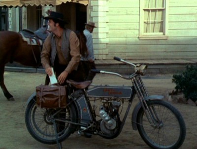 Ketcham, bored out of his skull like everyone else in town, sees Nichols’ arrival as a chance to push around someone new, with Nichols all too glad to skip out of town…once he’s busted up the Salter Hotel during a full-blown drunk. On the lam with Ruth (Margot Kidder), the sexy barmaid at Salter’s, Nichols thinks he’s being chased for the bar fight and because of Ruthie, but in reality, Ma and Ketcham and his posse want Ketcham’s prized car back…which Johnson stole. Nichols, loathe to really shoot it out with Ma and Ketcham, works out a deal with the admiring Ma and returns to Nichols. There, he’s forced by Ma to assume the town’s sheriff duties, now shared with dirty little coward Mitch (Stuart Margolin), in lieu of paying off the bar’s damages, with his makeshift “jail” established in the box room below Salter’s hotel, and his horse traded in for the wave of the future: a Harley-Davidson motorcycle.