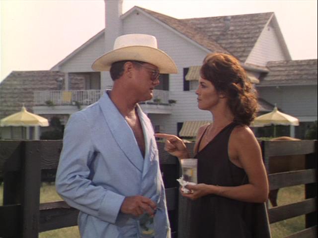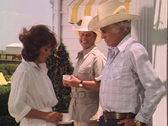 Series creator and this show’s scripter David Jacobs pulls off one of the most amusing Dallas episode openers. J.R. Ewing, just getting off the phone after issuing orders for someone to be let go from Ewing Oil before their retirement benefits kick in, stares fixedly at sister-in-law Pamela Ewing’s enormous breasts, as she floats in the Southfork pool. His frustrated wife, Sue Ellen (Linda Gray), working a crossword, asks for a five-letter clue for “water markers.” “Buoys,” J.R. mutters, eyeing pneumatic Pam. Brilliant.