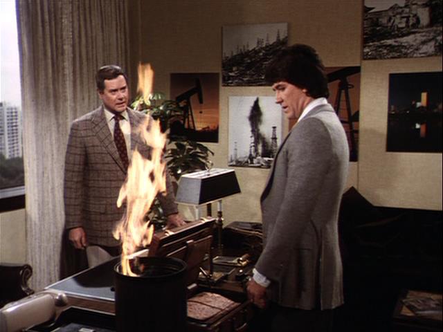 A familiar TV plotline—Bobby’s school idol (Richard Kelton) turns out to be a scamming failure—continues to set up the premise that J.R. will do anything to drill on Southfork, including taking advances on those non-existent drilling rights (he’s sweating bullets when it looks like Miss Ellie will let Bobby and his college friend Guzzler build their crappy strip mall right on Jock’s old capped off well). Familiar territory, dramatically, but put over well, particularly by charismatic Kelton, who died tragically just a week before this episode aired. A faulty trailer heater killed him on the set of NBC’s miniseries, Centennial…for which NBC was fined a whole $720.