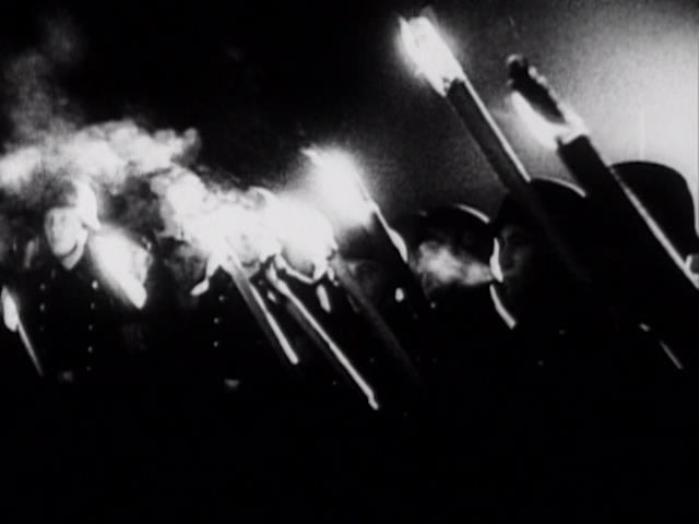 Mora constantly intercuts these idyllic rural pastiches with the crushing, brutalizing nature of the Nazi rallies, with their apocalyptic, Wagnerian scale and absolutely rigid formations, where the German people became part of a mass thing that lost all individuality and ultimately, humanity. And of course, to reinforce that dehumanization, and keep a lid on any seditious free thought, the center of non-democratic Nazi government—the grotesquely over-scaled, crassly opulent New Reich Chancellery—is shown by Mora’s selections to be an oppressive entity that’s specifically designed to overwhelm and cow anyone who dares enter it (and let’s not forget the goon squads that are needed to keep order, such as the ’38 Munich “Commemoration of Dead Comrades” rally, shown here in deadly, terrifying stillness, the helmeted soldiers lined up like emotion-less mechanical robots, illuminated by huge barbaric torches and phony De Mille-lite mythologizing).