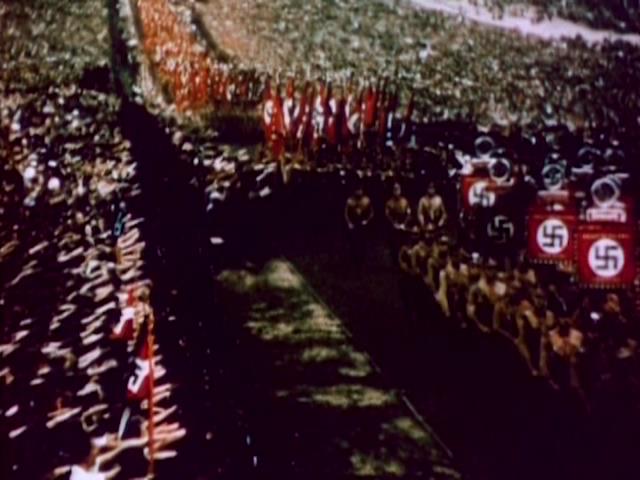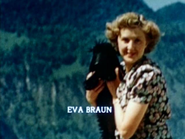 At first glance, Swastika’s main claim to fame is the re-discovery, during pre-production, of Hitler mistress/wife Eva Braun’s 16mm home movies, which formed the basis of this documentary on the Nazification of Germany. In her color footage (it was extremely rare and expensive at that time to shoot in color), civvies-clad Adolph Hitler is seen relaxing at his spectacular Bavarian mountaintop retreat, the Berghof, with prominent Nazis like Heinrich Himmler, Albert Speer, Joseph Goebbels, Joachim von Ribbentrop, and Martin Bormann all milling around, smiling and joking for the camera. It was the only known movie footage depicting Hitler outside of military and political rally situations, and as such, of great historical importance (at least, initially, to the producers of this documentary).