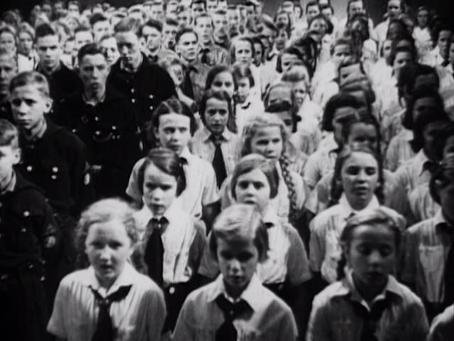 If Mora oversteps at times with obvious commentary, such as having the Helen Morgan torch song, What Wouldn’t I Do for That Man, play over shots of Hitler (or, sad to say, making Noel Coward’s delightfully fierce Don’t Let’s Be Beastly to the Germans sound trite), those are isolated moments. He consistently hits his target, frequently with the scenes that somehow upset the baffled critics. How could a reviewer not see the obvious connection between Mora slowing down and repeating a shot of a “humanized” Hitler cuddling a baby at a private ceremony, followed and intercut with a manipulative Hitler “cuddling” his receptive, adoring audience at a rally…followed by Nazi henchmen Herman Goering and Goebbels handing out toys to children at Christmastime? What part of that montage didn’t you get, fellas?