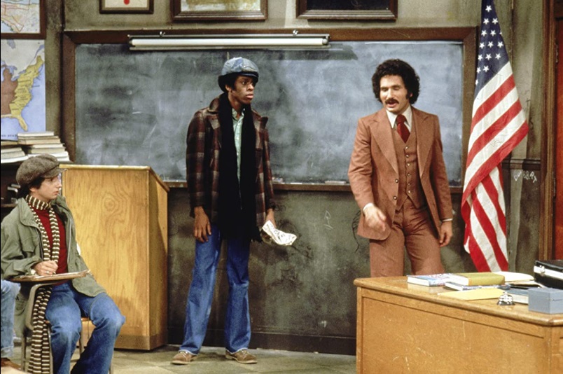 Prior to Welcome Back, Kotter‘s premiere, ABC had a modest hit with Room 222, which tackled the serious problems of urban teenagers in a Los Angeles high school. Although there were moments of low-key comedy in the show, it was essentially a serious drama with a message. As the strident militancy of the late 1960s and early 1970s counterculture finally started to fade away in the mid-70s (and since that zeitgeist was largely a bust on network TV, anyway), there was room for a show like Welcome Back, Kotter, which took Room 222‘s basic premise (with a little of The Blackboard Jungle and To Sir, With Love thrown in for good measure), and turned it into a farce.