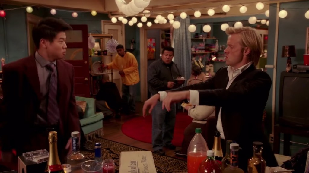 Kimmy’s turning 30, and it’s party time at the apartment! Among the guests are Logan and Dong, who fight over Kimmy as only those two stereotypes can; and her half-sister Kymmi (Kiernan Shipka) (pronounced keeey-me), who arrives unexpectedly with her state trooper father (Tim Blake Nelson), the idiot Indiana cop who couldn’t solve Kimmy’s disappearance, but who wound up marrying her mother while Kimmy was in the bunker.