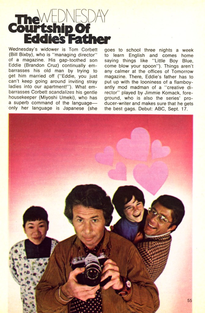 The Courtship of Eddie’s Father, like several other ABC sitcoms from this era—The Flying Nun, The Odd Couple, The Brady Bunch, Nanny and the Professor—was at best a mid-level performer in the Nielsen ratings during its original run (remarkably, considering their name recognition, none of those series cracked the Top Thirty), before it later achieved a healthy level of pop culture awareness from seemingly endless repeats in syndication. To be fair, ABC’s station clearance was lower than NBC’s or CBS’, so a show had to be a massive hit, like Bewitched or The F.B.I., for it to track in the Nielsen’s. The Courtship of Eddie’s Father certainly wasn’t a “massive hit” with anyone when it first premiered for its relatively short 3-year run, but tens of millions of viewers all over the world have seen it since then, with that infectious Nilsson theme song recognizable with viewers who haven’t even seen the show (also because it’s been parodied and referenced in so many other works).