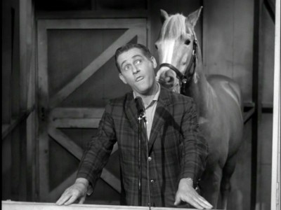 Regardless of what trick was employed to move Mr. Ed’s mouth—at times, it was nylon string stuck under his gums; sometimes it was trainer Hilton tickling his feet on cue; and later, Young claims Ed miraculously “learned” to mime talking whenever he, Young, finished with a line, right on cue—the trick is so simple and yet so effective that to this day, it’s almost seamlessly matched with Lane’s equally accomplished vocals. That horse is acting; I don’t care if someone was tickling his mouth with thread or not, his watchful stillness and his perfectly timed head movements make the effect absolutely convincing. Just like that dolphin in Flipper—you either have star quality or you don’t. And Mr. Ed. had that “X factor,” that certain…something.