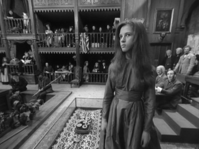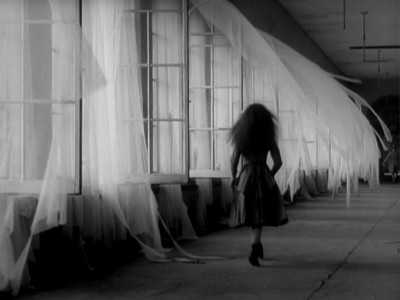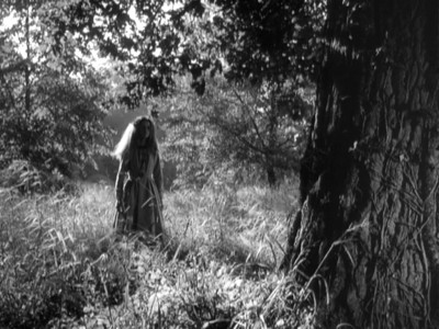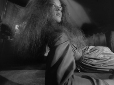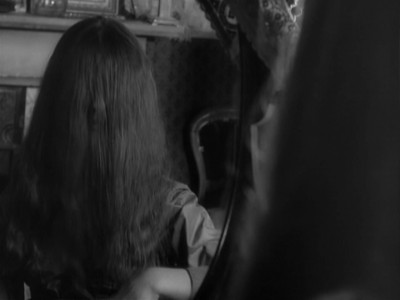 Miller’s insistent dream-like aesthetic carries over into the visuals, as well (Miller insisted on 35mm black and white film, as opposed to the BBC’s usual grainier, less-defined 16mm). Miller and cinematographer Dick Bush achieve, through extra-wide camera lens and foreshortening, some remarkably simple―and quite disturbing―effects shots of Alice changing in size, with an insolent Alice often staring right back at us as we realize she’s not as she was before. Alice in Wonderland‘s most alarming visuals have to be during the cottage sequence, when not only is Alice grotesquely enlarged within the room, she also finds herself sitting in front of a mirror, whispering she doesn’t know who she is, as she combs her hair slowly over the front of her face, like a deeply disturbed mental patient.