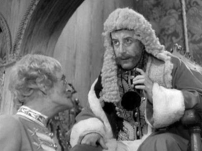 Alice then comes upon a tea party given by the Mad Hatter (Peter Cook), the March Hare (Michael Gough), and the Dormouse (Wilfred Lawson). Alternately rambling on and sitting silently, the tea party goes on forever, before Alice leaves and encounters the Gardener (Gordon Gostelow), who is painting white roses red for the Queen of Hearts (Alison Leggatt). Soon, the Queen, the King of Hearts (Peter Sellers), and the Knave of Hearts (Peter Eyre), arrive by procession, and Alice follows along for a croquet match (after defying the Queen when Alice is sentenced to beheading: “Off with her head!”). Alice gets an unwanted lesson in morals from the nattering Duchess, before the Gryphon (Malcolm Muggeridge) takes her to the sea to see the Mock Turtle (Sir John Gielgud), who can’t finish his life story because he never starts it. The Mock Turtle and the Gryphon dance at the sea edge, before Alice finds herself at Court, where she’s on trial, and where she refuses to be quiet as the impotent Queen screams over and over again, “Off with her head!” Alice awakes in the tall grass, and leaves with her sister.