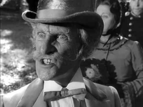 Shot by cinematographer Dick Bush in a strange combination of a stiff, formal Daguerreotype-approximated aesthetic filtered through silent film framing, and a 60s gothic horror Hammer outing (full of grotesque, fish-eye lens close-ups and hyper-real deep-focus scenes that always seem to suggest some kind of seething, on-the-verge violence), Alice in Wonderland doesn’t look like anything I’ve ever associated with the literary source. Gone are the expected animal heads and costumes for the actors; gone largely are any elaborate, colorful special effects shots (both gone because of Miller’s artistic vision…and his BBC budget); gone almost completely are any moments of fake whimsy, or gaiety, or manic slapstick which often seems to get pasted on other adaptations of Carroll’s book.