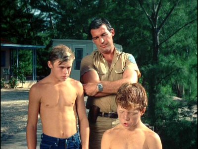 Bud and Sandy’s adventures take place largely at their father’s place of employment: Coral Key Park marine preserve. Their father, Porter Ricks (Brian Kelly), is the Chief Ranger at Coral Key, and he’s responsible for keeping the fish and wildlife in the preserve safe from poachers and careless visitors, as well as frequently aiding the Coast Guard in rescue operations for boaters in distress. A widower (a handy plot device, because a 1964 TV mother would never allow the boys to do some of the things they do here), Porter and the boys live at the Park, in a beach shack right by their own dock. There, Bud and Sandy often visit and swim with their “pet” Flipper, an extremely friendly and intelligent bottlenose dolphin who stays close to the boys, and who comes when the boys use an underwater horn to call him.