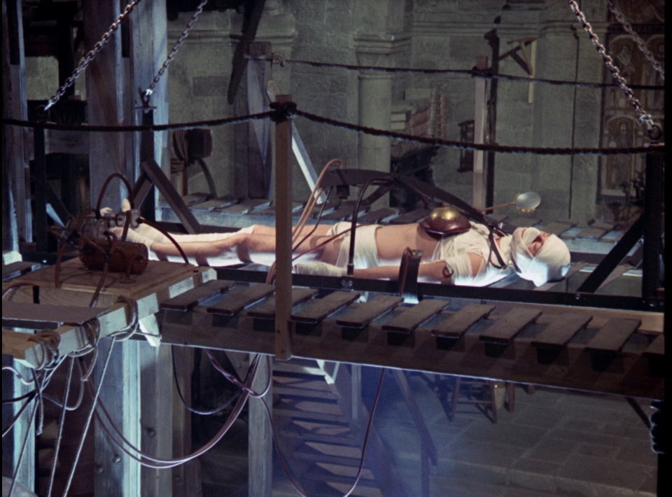 Second, once Victor has placed Henry’s brain in the Creature’s body, he utterly forgets about Elizabeth as he enjoys a relationship with his Creature that is, in almost every way, a “marriage” (which also brings up elements of incest as well, since Victor is also “father” to the creature). When the Creature is born, both he and Victor comment on how beautiful they both are (Sarrazin’s clingy little gauze bandage number only emphasizes the sexual nature of his relationship with Victor—perhaps an influence on The Rocky Horror Picture Show?). After the solar conflagration that brings the Creature to life, they both move towards each other, to remove the coverings from each other’s eyes, so that they may see each other for what they really are—soulmates.