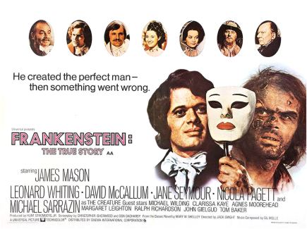 Recently released on Blu-ray by Shout! Factory‘s label, Scream Factory, 1973’s NBC “major movie event,” Frankenstein: The True Story, is a fascinating, rewarding take on the much-reworked Mary Shelley literary classic. Written by Christopher Isherwood (mostly) and Don Bachardy, and directed by Jack Smight, Universal Studios went all out for this epic TV movie/mini, snagging a stellar cast including James Mason, Leonard Whiting, David McCallum, Jane Seymour, Nicola Pagett, Michael Wilding, Clarissa Kaye, Agnes Moorehead, Margaret Leighton, Ralph Richardson, John Gielgud, Tom Baker, and Michael Sarrazin (as the Creature), and spending lots of dough for expensive European location shooting and lush sets.