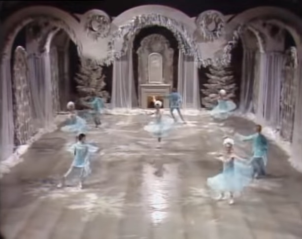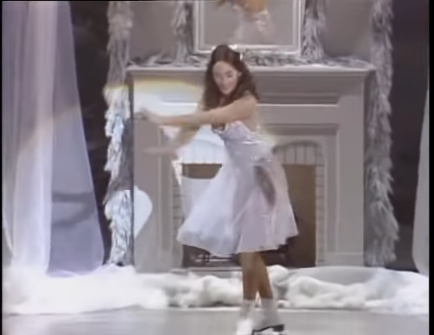 5-time U.S. champion, 3-time world champion, and Olympic gold medalist Peggy Fleming’s first skating number is top-notch, as she gracefully moves through a particularly evocative set (it reminded me of the Doctor Zhivago “ice house” set, only larger), all frosty blue and white, with a roaring fire as a nice counterpoint as Perry is heard singing It’s That Time of Year. Lovely.