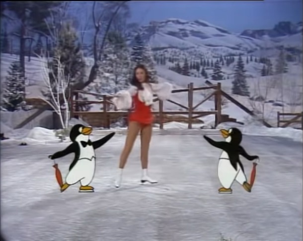 Peggy has another graceful skating bit, this time with animated penguins (kids probably liked that…although she looks mortified going in for that double kiss), before Perry has the impossible task of not plugging his latest hit Christmas single, Christmas Dream. The reason he can’t really “sell” it? It was then being featured in the big-screen movie, The Odessa File, with Jon Voight, a suspense thriller about Nazis and the Holocaust (not exactly a link GTE was looking for with their Christmas special).