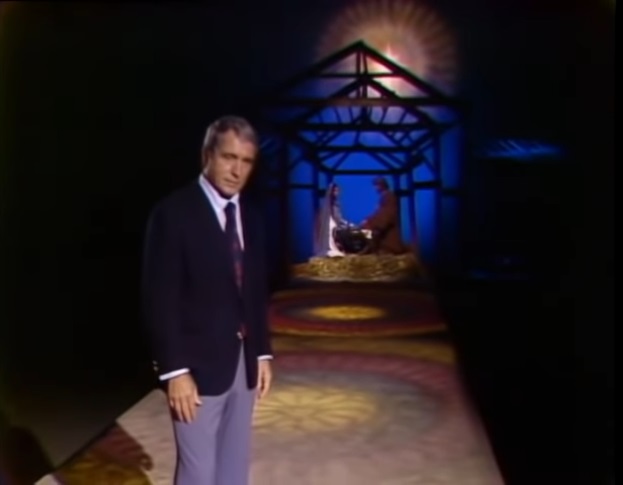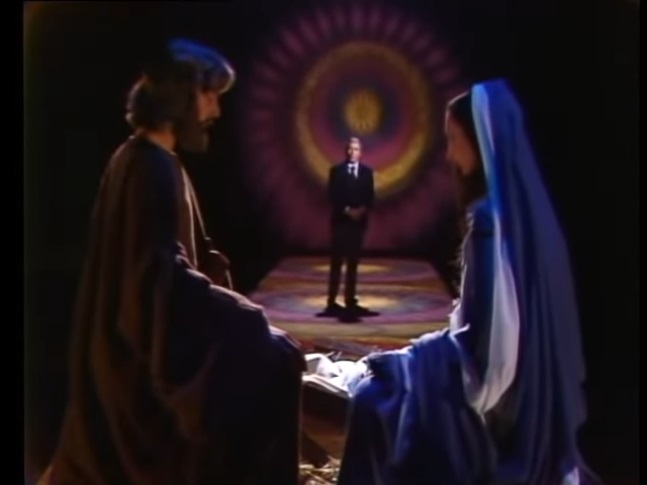 Como then narrates the story of the first Christmas, a story he says we like to hear again and again “because of what it says, and because it’s true,” (you have to admire his faith and certainty—what superstar would lay out his Christian beliefs so plainly, without fear, today?). This segment is quite well done from a technical standpoint, with imaginatively stylized sets, beautiful lighting (lighting director John Freschi won an Emmy for his work here), and the effect of several carols sung by Como, such as O Little Town of Bethlehem, The First Noel, Hark! The Herald Angels Sing, Oh Come All Ye Faithful, and We Three Kings, laid over the soundtrack (if you’re not familiar with these songs, it’s because some lawyer 30 years ago said you weren’t allowed to sing them in school). Thankfully, Rich Little does not show up as George Burns, playing the innkeeper (my wife did, however, suggest that Joseph may plausibly have been the actual father of Jesus, because the actor playing him was quote/unquote “hot, like Kris Kristofferson.” Thank you for that cogent hermeneutical observation, Donna).
