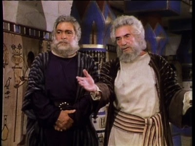 First up is The Story of Moses, starring John Marley and more importantly, his gorgeous head of hair (beautifully washed, set, and combed-out, I might add), back from Volume One as the man with God’s plan, Moses. Now that God has laid down The Law, it’s time for the Chosen People to split from evil Pharaoh (Joseph Campanella). Pharaoh’s advisors (Robert Alda, Lloyd Bochner) sneer that the Jews are just loafing it, but apparently Moses means business: let my people go, or I swear to Jehovah that the work stoppage on those bricks will make an ILWU dock worker’s strike look like a potty break.