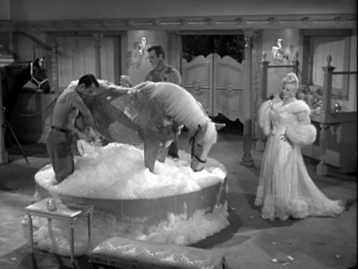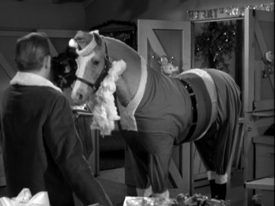 Co-producer George Burns does an amusing audio drop-in during Don’t Laugh at Horses, when Mister Ed impersonates the legendary comedian; Connie Hines vamps the then-current Cleopatra craze…to no discernible effect on Wilbur (“What would thou have of me, Marc Antony?” she breathes as she tries not to bust out of her form-fitting gown (again…jesus christ), to which that imbecile Wilbur replies, “I would have a pair of dry socks.”). Spring Byington has a funny supporting turn in Oh, Those Hats!, while familiar character actor Lee Goodman gets the biggest laughs as a door-to-door salesman reacting―favorably―to Wilbur in drag (“Wear what you want,” he leers, with a wink).