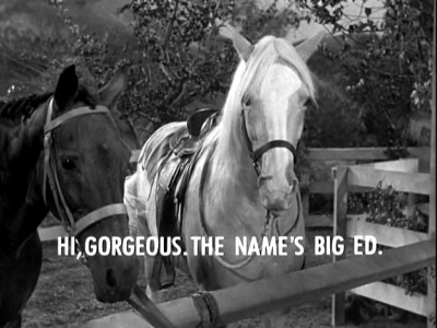 Saddles and Gowns has “Devil Ed” showing up over Ed’s shoulder, complete with a hysterically funny evil laugh from Rocky Lane, while I quite enjoyed the semi-pilot try-out of Moko, a live-action/animation combo featuring familiar character actor Dave Willock as the voice of Martian Moko, who flies into people’s ears, taking over their bodies. It’s a silly, one-note idea that probably wouldn’t have worked over a full season, but it makes for a very funny episode here (an atypical one where Mr. Ed isn’t front and center―I’m surprised they didn’t have Moko fly into Mr. Ed’s big ear).