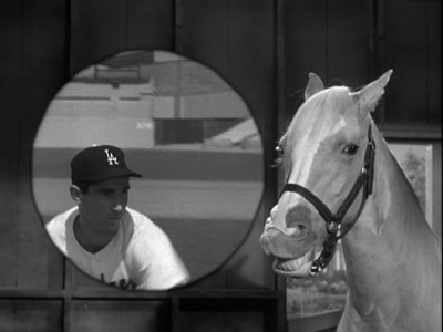 Reviewing the third season, I couldn’t help but feel Mister Ed was wearing on a bit, but happily, and despite the drastic changes in the cast, this fourth go-around seems more in line with the second season: solid jokes, solid gags, and good energy from the cast. Opening with a bang, Leo Durocher Meets Mister Ed certainly contains a signature sight gag for the series: the image of Mr. Ed sliding into home at Dodger Stadium (through the magic slo-mo clarity of DVD, check out how disturbing that dummy/horse corpse[?] looks going into home plate). Written by Lou Derman (who else) and Michael Fessier, Leo Durocher Meets Mister Ed is a heavy hitter with the laughs, with memorable bits like Wilbur putting his foot down with Carol about not going on a trip to Palm Springs…before she immediately tells him to start packing; Carol’s rather arresting swimsuit diversion (like seriously…wow) that goes nowhere with oblivious dimwit Wilbur (Connie Hines, looking terrific as always), Durocher himself getting the episode’s best line, when Wilbur mentions Archimedes (“Archimedes? What team is he playing for?”), and of course, all those Dodgers, including long looks at Sandy Koufax, John Roseboro, Willie Davis, and Bill “Moose” Skowron.