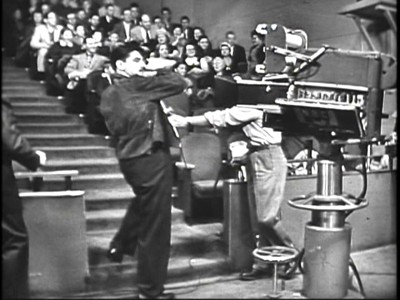 Of course, it’s mesmerizing (and funny) to watch Kovacs in his later “Eugene” character, making his way through a surrealistic television universe where the laws of physics don’t apply. But those last forays into auteurist comedy are rigidly controlled by the meticulous Kovacs; they’re as much expressions of iron will as inspired comedy. The “early” Kovacs, though, is fast and loose and ad-libbing like a fiend, laughing with his rowdy off-camera crew, and reacting with a measure of searching puzzlement when he encounters laughter from his lagging-behind live audience. That’s the early television, the “early” Kovacs, that brings that period of history alive to me―and the one that makes me laugh the hardest.