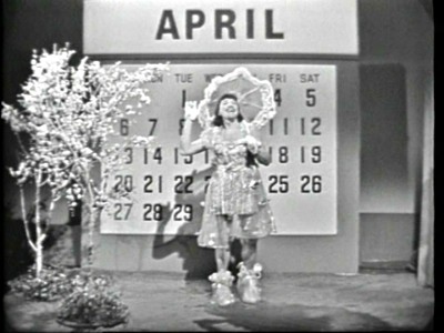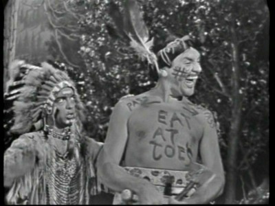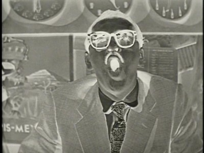 Highlights from these five episodes include Kovacs’ spoof of kiddie puppet shows and Captain Video, with The Kapusta Kid in Outer Space (the key joke you need to know to “get” this spoof is that “kapusta” is a traditional Polish sausage-and-cabbage dish). Ernie’s overtly sexual, hysterical peeping through the lens of the camera at “the lady in Flatbush who takes a shower every day at this time” I’ll bet gave some pause to a few of the less technically-savvy viewers out there. When Ernie’s interview with a kid in the audience goes long, he has a tech put a skunk into frame so Ernie can introduce his “producer.”