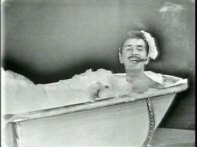 The next special (from October 28th, 1961), recycles a funny bit about an interviewer knowing more about his interviewee’s story than the interviewee himself, before we’re given some classic Kovacs visual gags, like the school for skin-divers (it’s Ernie, typing away at a desk, underwater), and a submarine that “up scopes” in a bathtub with luscious Jolene Brand (lucky sub, the male viewers must have mused back in ’61). Brand, a longtime Kovacs actor, is even better as the sexy weather girl who discusses the climate in breathy hipster lingo as she seductively lounges on a chaise.