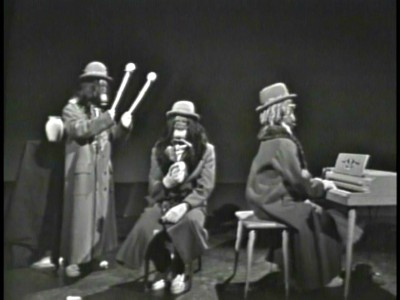 But I do distinctly remember when I first saw them, at 12 years old, and how I was fascinated by the utterly bizarre combination of the truly ugly ape masks and wigs and overcoats, contradicted by the upbeat music of Robert Maxwell’s Solfeggio, and the true, hilarious suspense of wondering what was going to happen (the drumsticks to the head, man)…and then waiting for it to happen again and again. It’s such a simple, even silly gag. And why it’s so funny, I don’t think I can explain; you just have to see them yourself. Perhaps it’s because it’s the perfect visual embodiment of Kovacs’ humor: at once joyfully childlike (and cartoonishly violent), and surrealistically, self-mockingly, hipster cool. Once seen, you never forget them.
