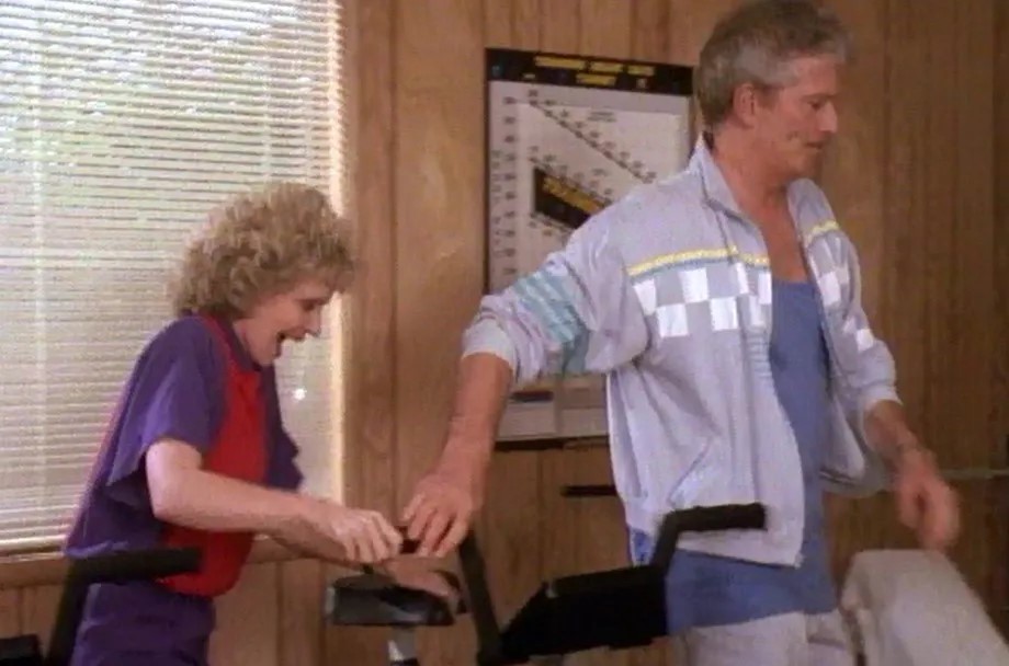 Reed’s first scene with Henderson finds him shimmying back and forth on his exercise bike, wearing that fem scooped neck T and pastel-colored exercise togs, and sporting Bea Arthur’s exact hairdo from seasons 1 through 3 of The Golden Girls, and you start to wonder if he’s morphed into Henderson’s bitchy gay friend from the gym, rather than her husband and romantic partner of 20 years.