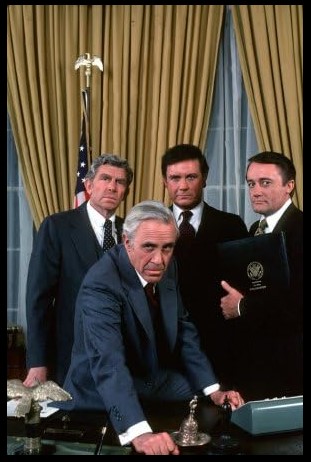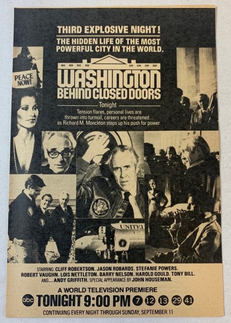 I’m certainly no scholar or even student of Watergate, but I remember enough to clearly match up the dots in real-life Watergate criminal John Ehrlichman’s thinly disguised tale. Anyone from my generation is going to immediately see Andy Griffith is LBJ (talking about his President “Curry,” who’s JFK), Monckton is Nixon, Martin is the CIA’s Richard Helms, Dr. Tessler is Dr. Henry Kissinger, Flaherty is W.H. Chief of Staff H.R. Haldeman, and so on. And that’s half the fun of Washington: Behind Closed Doors: watching the complicated plot unfold and trying to remember what’s real, what’s been fudged, and what’s been outright fabricated (it’s one of those docudramas that impels you to go on the net and try and backtrack it all).